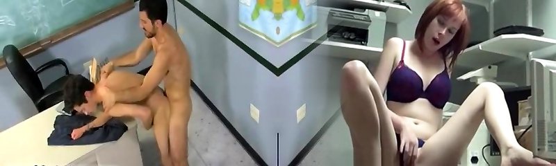 Youthful coeds fucking with muscular hunk on the Desk...