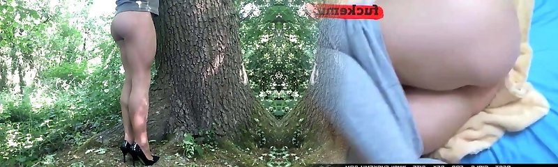 Tan pantyhose and heels in the woods .